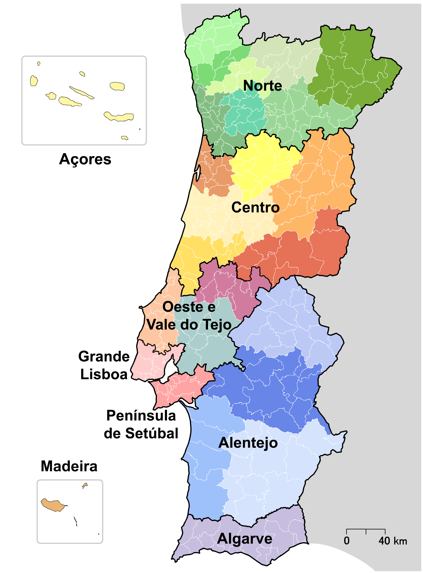 Karte der Regionen in Portugal – Petnog, CC0, via Wikimedia Commons (NUTS PT 2024(original).png